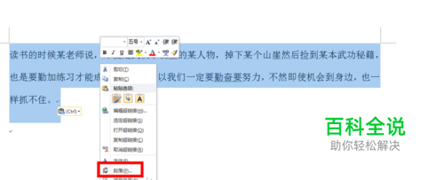 首先要选中你要调整行间距的文字,然后单击鼠标右键,选中段落