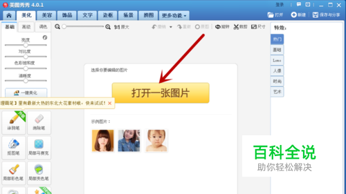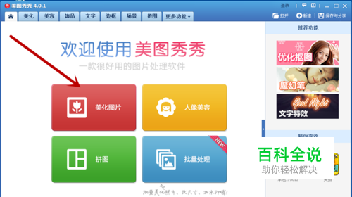 打开“美图秀秀”软件,进入软件后选择“美化图片”,如下图: