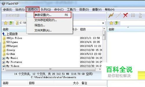 我们最开始不是提示“PASV 模式失败, 尝试 PORT 模式”最后才“PORT模式成功”的吗?所以我们需要把被动模式修改为主动模式。 下面就以FlashFXP为例来说明: 首先“选项”->“参数设置”