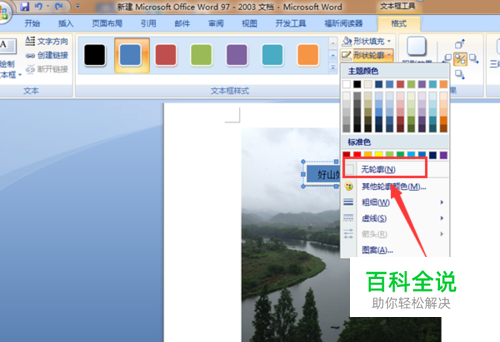 文字的背景颜色已经设置好了,这时我们又会发现文字的背景颜色跟图片之间有白色的轮廓,这时我们可以点击格式→形状轮廓→无轮廓操作来取消。