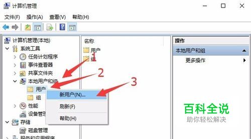 在打开的 计算机管理窗口中,双击 本地用户和组,右键点击 用户,在弹出的 菜单中,单击 新用户。