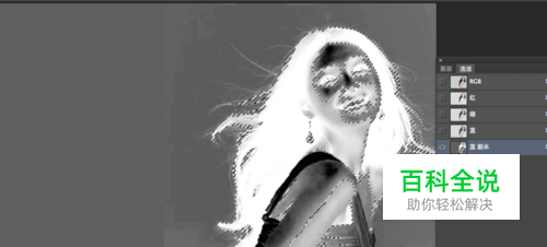 色阶执行完成后,我们执行图像>调整>反向,得到下图效果,我们这时候会发现头发全都变成白色了,我们再执行,通道下方的将通道转化为选区,这个按钮,完成之后我们会发现我们创建了一个选区,头发白色全部选中。