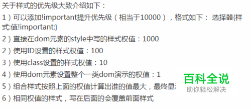 关于样式的优先级大致介绍如下: 1)可以添加!important提升优先级(相当于10000),格式如下: 选择器{样式:值!important;} 2)直接在dom元素的style中写的样式权值:1000 2)使用ID设置的样式权值:100 3)使用class设置的样式权值:10 4)使用dom元素设置整个一类dom演示的权值:1 5)组合样式按照上面的权值计算出谁的值最大,最终显示的就是哪个样式 6)相同权值的样式,写在后面的会覆盖前面样式