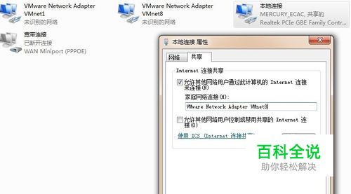 右击 本地连接 ,点击共享,勾选 允许其他网络用户通过此计算机的Internet连接来连接(N) 文本框下选择 VMware Network Adapter VMnet8 即VMware NAT连接模式的网卡