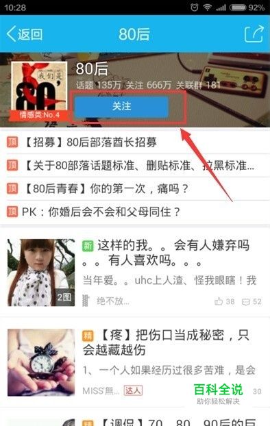根据自己的兴趣,在搜索框中输入感兴趣的部落的关键字,比如【80后】等等。