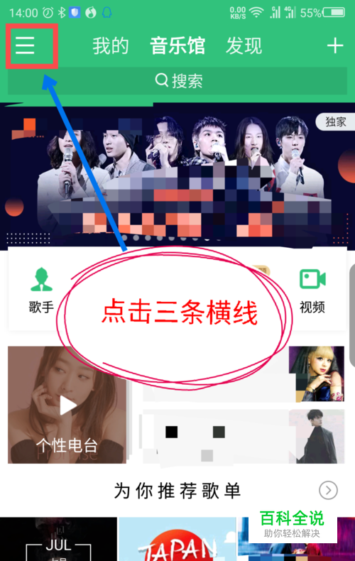 打开QQ音乐,在说软件首页界面,点击左上角的三条横线。