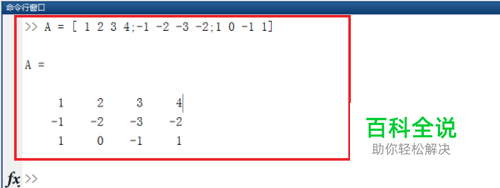 第二步在命令行窗口中输入A = [ 1 2 3 4;-1 -2 -3 -2;1 0 -1 1]来创建一个A矩阵,按回车键,将A变量存储到系统中,如下图所示: