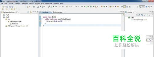 首先,打开MyEclipse软件,建一个类,在代码编辑窗口中,写出想要打开的常用类的类名,如图所示。图中以“String”类为例进行说明。下面讲解如何打开源代码的三种方法。