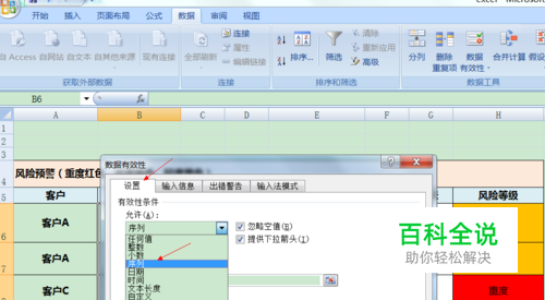 在数据有效性页面选择设置——有效性条件—允许,选择序列。