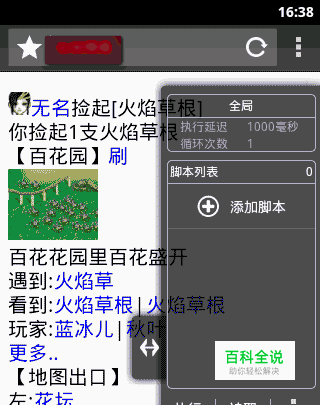 步骤11: 第五个脚本执行成功,浏览器点击了“火焰草根”,捡起了怪物掉落的物品