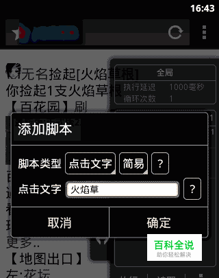 步骤2: 点击脚本列表中的添加脚本,在弹出脚本对话框里选择点击文字-简易,在“点击文字”对话框输入“火焰草”,也就是我们要刷的怪物,然后点击对话框的确定按钮。