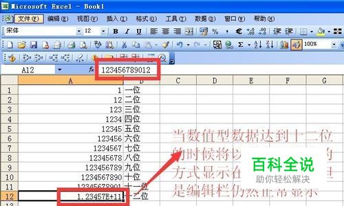 当数值型数据达到十二位的时候将以科学级数法的方式显示在单元格内,但是编辑栏仍然正常显示