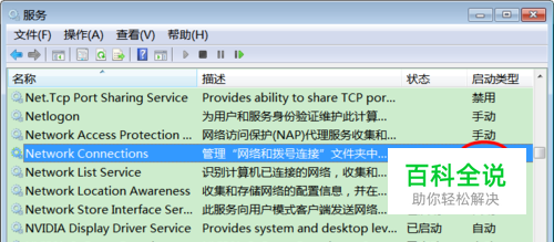 确认Network Connections 服务没有被禁用 按下Win+R,打开运行对话框,输入services.msc,打开 服务管理功能,找到Network Connections服务,确认启动类型不是" 禁用",如果启动类型是" 禁用",则双击服务,将启动类型修改为" 手动",然后选择该服务,右键菜单 启动该服务。如果服务已经启动,但无线网卡的图标没有恢复正常,则继续尝试后面的步骤。