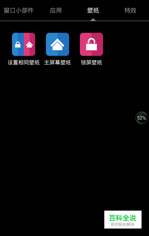 长按主页面空白处2~3秒,会切换到窗口小部件界面。点击触摸屏上方选择“壁纸”。(在这里也可以设置其他的一些东西,例如特效等等)。