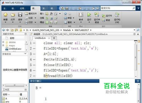 第一,启动MATLAB,新建脚本(Ctrl+N),输入如下代码:close all; clear all; clc fileID1=fopen('test.bin','w'); A=[1:5]; fwrite(fileID1,A); fclose(fileID1); fileID2=fopen('test.bin','r'); B=fread(fileID2) fclose(fileID2); 其中第2行到第5行是往二进制文件test.bin中写入数据;第6行到第8行是读取二进制文件test.bin中的数据。
