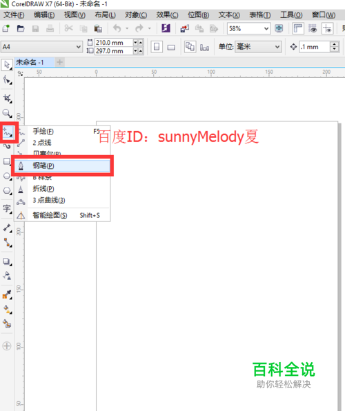 打开CorelDRAW的软件,选择工具箱中的钢笔工具,在画布上先点击一下,再点击拖动画出一条曲线,后面的依次继续,画到最后一步后,直接按空格键结束曲线绘制。