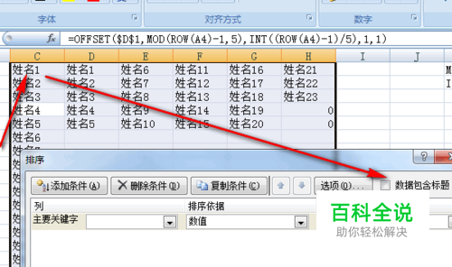 在弹出的对话框中——勾选数据包含标题。这样就告诉excel:我的第一行不用排序。