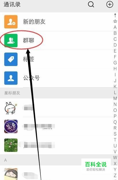 手机打开微信,选择“通讯录”点击【群聊】如图所示。