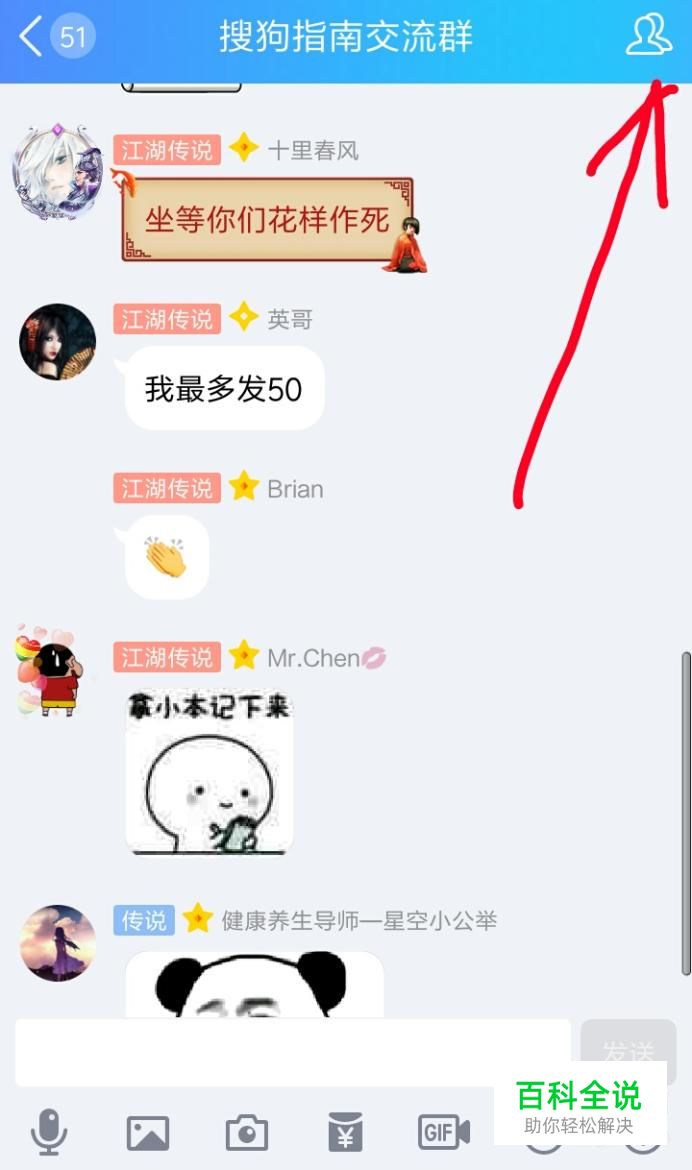 打开手机QQ,进入一个群的聊天界面,点击如图箭头所指按钮进入群资料。