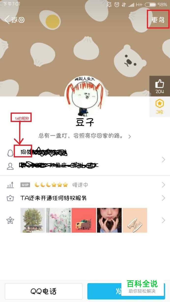 第二步,找到我们要查看的好友。点击好友,就会弹出ta的主页,如下图所示,红框框勾选的就是ta的昵称啦,如果觉得还不过瘾的话,那你还可以点击右上角的“更多”,进入ta的详细信息页面,就可以看到更多信息:昵称,ta的详细资料,你给ta的备注.......