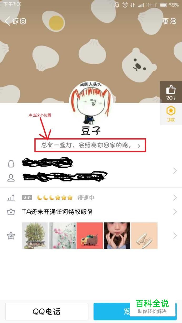 好啦,上面我们讲到了昵称,那现在我们接着说查看qq好友的历史签名吧。第一个步骤和之前一样,找到我们要查看的好友。点击好友,就会弹出ta的主页,然后我们点击昵称和qq号上面一点的那个位置,也就是qq个性签名的位置,如下图,点击红色框框区域位置