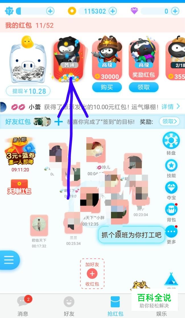 进入派派APP,在下方菜单中选择“抢红包”,然后点击如图箭头所指的红包卡就可以收取红包了;