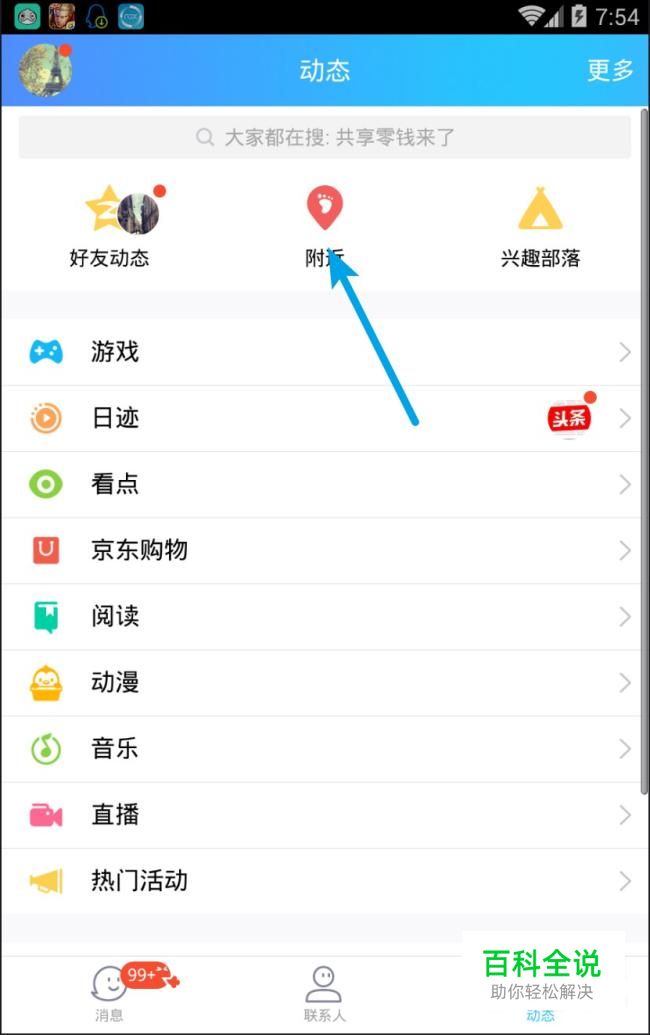上面也出现三个模块,好友动态,附近,兴趣部落。注意是上面的三个模块,点附近。