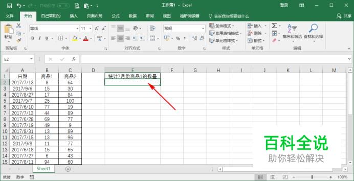 这里有一张商品1和商品2的出货数量表,因为是按照票据录入并没有按照时间先后进行录入,现在要统计商品1在7月份的出货数量填入到E2单元格中
