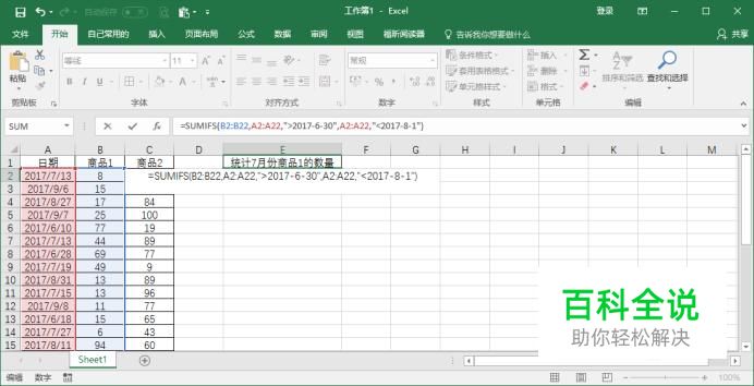 在E2单元格中输入公式SUMIFS(B2:B22,A2:A22,">2017-6-30",A2:A22,"<2017-8-1"),输入后按回车确认