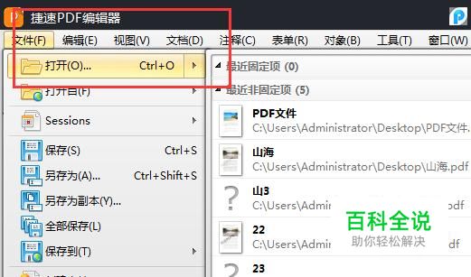 在桌面把捷速PDF编辑器打开,选择“打开”按钮,将PDF文件打开