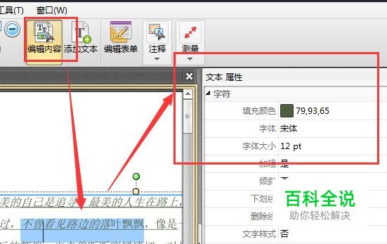然后在上方菜单栏中选择“编辑内容”然后软件右侧会出现一个“文本属性”