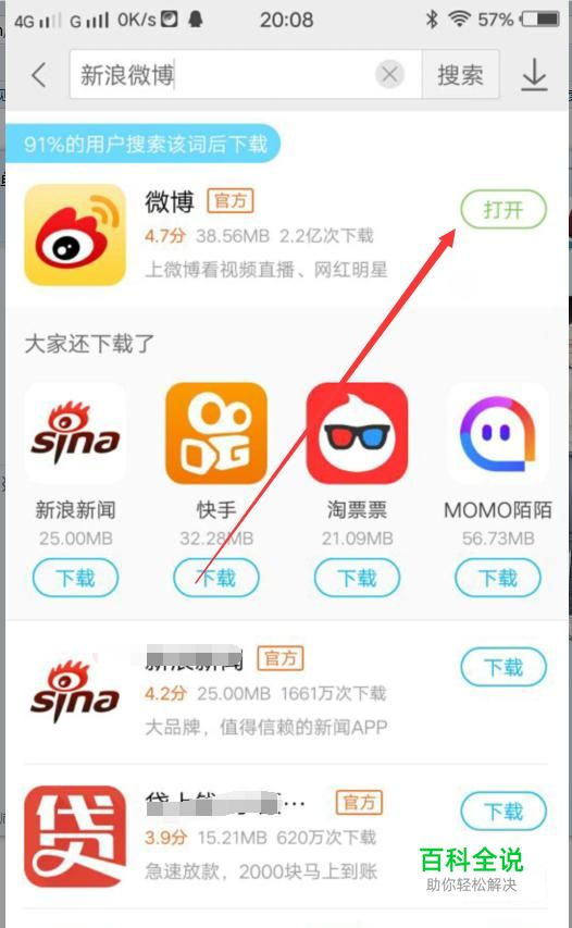 点击打开手机上的应用商城搜索新浪微博。然后下载安装软件。