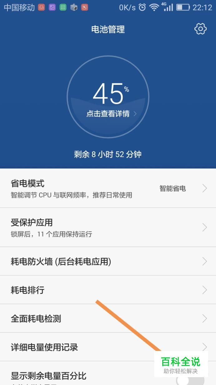 为了方便,可以在该页面,点击显示剩余电量百分比,这样就可以直接在手机右上角看到电量剩余情况了,效果如图所示。