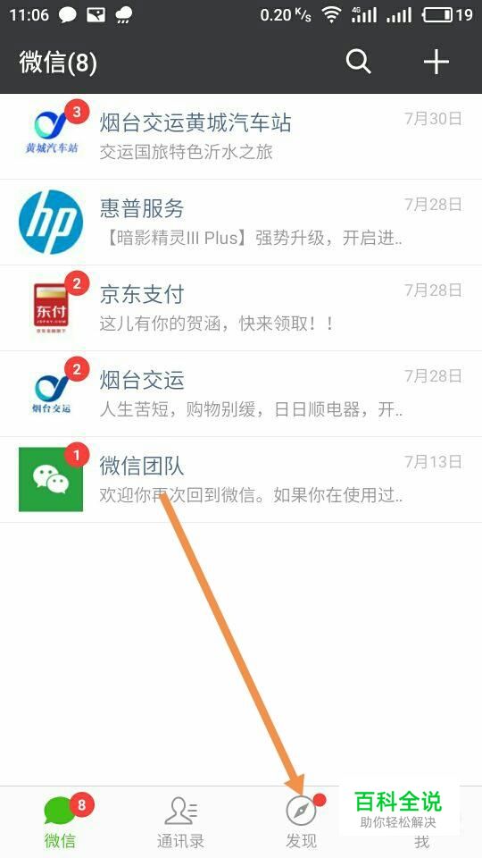 打开手机微信,在打开页面,单击发现。