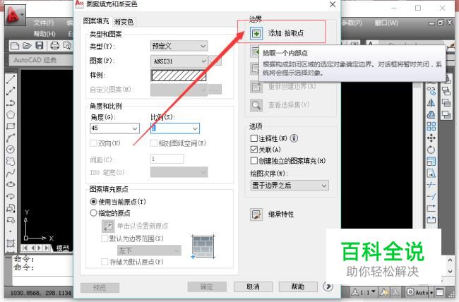 鼠标点击“添加”拾取点按钮,出现选择光标,将光标移动到填充边界区域,点击回车键完成选择。