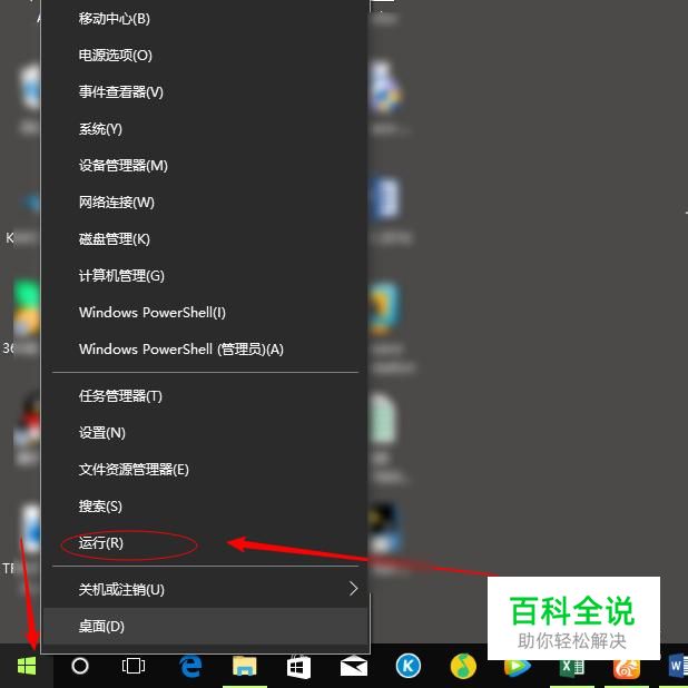 鼠标右击桌面开始按钮,选择运行按钮,如图。