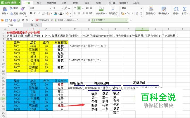 然后利用IF函数进行一个条件提示,如果是小于指定的条件就是需要补的,如果是不小于就是充足的,这样的话就可以很好的看到这个情况了 公式 =IF(C5<30,"补货","充足")这个就是很简单的一个理解方法。