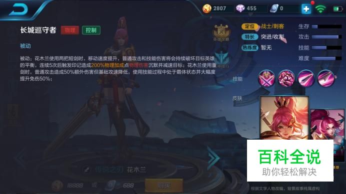 长城巡守者 被动:花木兰使用两把短剑时,移动速度提升,普通攻击和技能伤害将会持续破坏目标英雄的平衡,连续5次后触发印记造成物理伤害沉默并减速目标; 花木兰使用重剑时,普通攻击造成50%额外伤害但基础攻速降低,使用技能过程中处于霸体状态并大幅度提升免伤50%。
