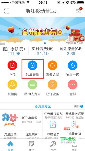 登录个人手机移动营业厅账号后,接着点击首页中的“账单查询”按键。