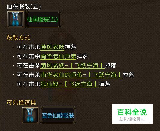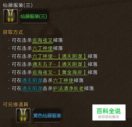 黄色仙藤服装: 需要先获得仙藤服装(三),这个需要进入副本【通天阴谋】和【黄金海岸】击杀小怪掉落。得(三)到之后,去交易线找【福星老爷爷】消耗50个福星令牌即可兑换获得黄色仙藤服装。 黄色仙藤头饰同上。