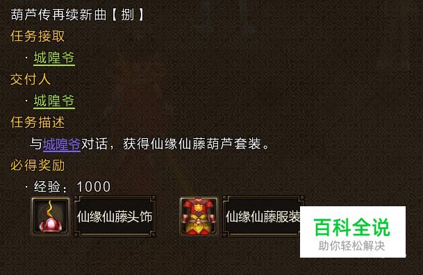 获得全部赤橙黄绿蓝靛紫七套仙藤时装后,去石塘县城找【城隍爷】还任务,就可以获得【仙缘仙藤时装】了,而且还会额外给一个【机灵穿山甲】宝宝。
