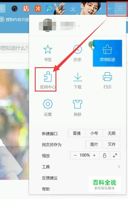 打开浏览器,点开更多选项标志,选择应用中心。