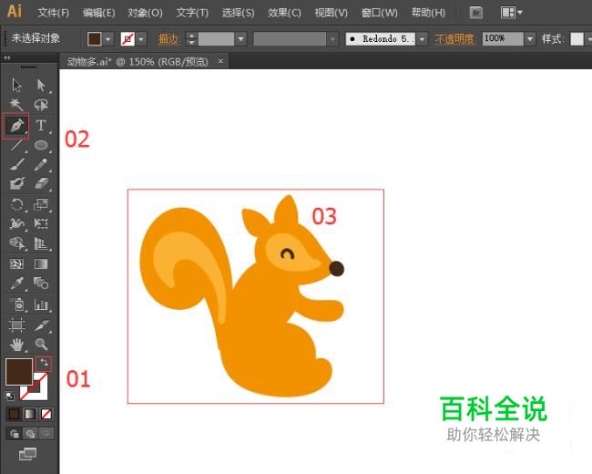 接着我们来到了我们的软件界面,在这里我们第一步:选择钢笔工具;第二步:双击描边;第三步:选择橘黄色并确定;第四步:画小松鼠(这个步骤就就需要功底了,我们的话可以先在纸上多尝试几遍,多画几遍,接着在用软件来勾画,那样我们就可以画的更加精准和快速),如下图所示。