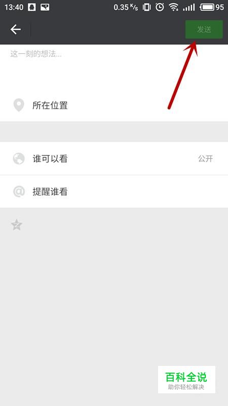 进入信息编辑页面,编辑完成后点击“发送”,就可以发送一条朋友圈信息。