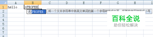 我们在旁边的B1单元格输入=PROPER(A1)时看到出现的函数解释,把文本字符串首字母变成大写,其余变成小写。