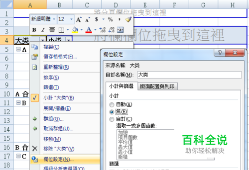 取消小计功能:右击“大类”->栏位设定,“小计与筛选”,小计为“无”