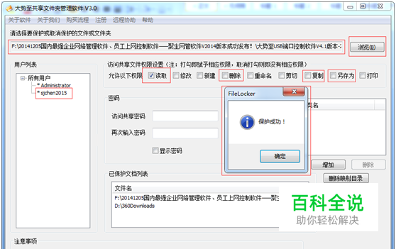 通过上述操作后,局域网用户打开共享文件后只能查看共享文件的内容但无法复制共享文件,也无法删除共享文件但可以修改共享文件(需要勾选赋予修改权限)、可以读取共享文件内容但可以阻止另存为本地磁盘,从而极大地保护了共享文件的安全。