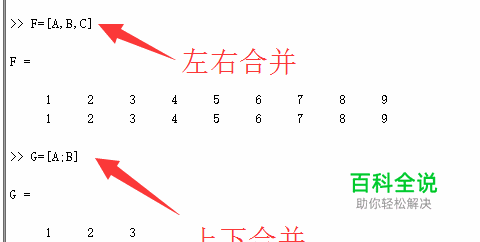 按照左右合并矩阵,需要对应矩阵行数相同,分别输入E=[A B]、F=[A,B,C]两句代码,即可实现,其中使用空格或者“,”均可。