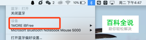 点击MacPro上的蓝牙小图标,鼠标右键打开蓝牙,在设备中找到要配对的蓝牙耳机名称,如:连接教程中使用的1MORE iBFree点击连接即可。电脑和蓝牙耳机配对成功后,蓝牙耳机指示灯从红蓝灯交替闪烁变成蓝色单闪状态。