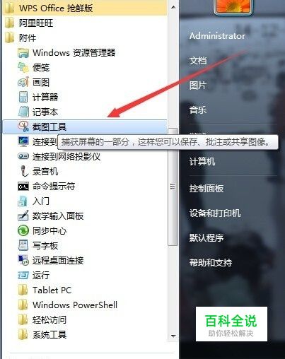 首先在Windows7系统桌面依次点击开始/所有程序/附件菜单项,在弹出的菜单中选择截图工具就会运行Windows7系统的截图了。